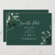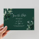 This emerald greenery green horizontal save the date card is perfect for a boho wedding. The elegant yet rustic design features moody dark green watercolor leaves and eucalyptus with a modern bohemian woodland feel.