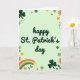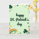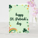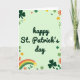 This greeting card features a pale mint green background with “happy St. Patrick’s day” centered in dark emerald green lettering that draws your eye right away 💚. The words sit calmly in the middle, leaving airy space around them like a quiet pause before a toast with friends. Around the edges, dark green shamrocks dot the border, as if they’re leaning inward to frame the message for someone special ☘️. A rainbow rises from the lower left corner, curving upward and adding a gentle, friendly spark that feels like sharing a private smile. Near the rainbow’s end, golden stars scatter like a small trail of treasure, giving the scene a light, romantic glint without needing any characters. Small flowers and extra stars in orange, red, and several greens are sprinkled near the perimeter, like confetti drifting around the greeting. The design keeps the center uncluttered while the corners and sides stay busy with shamrocks, flowers, and stars, and the rainbow arcs up from the lower left toward the middle-left edge.