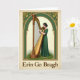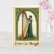 This card shows a young woman in an emerald-green gown standing on a small patch of grass as she plays a tall, richly carved wooden harp with golden strings 💚. Her dark hair falls neatly as she tilts her head down toward the strings, and the soft focus of her eyes feels like she’s playing for someone close, as if a friend or sweetheart is listening just beyond the frame. The harp curves beside her like a steady companion, and her fingers rest on the strings with careful precision, suggesting a quiet, intimate tune. Around her is a deep forest-green arched alcove, decorated with fine gold floral and curling details that make the scene feel formal and treasured. Inside the arch, a creamy light background glows gently, bringing out the green dress, the warm wood, and the gold accents ☘️. Beneath the artwork, the phrase “Erin Go Bragh” is centered and set in green lettering against a light area, easy to spot at a glance. The gold ornamentation traces along the arch’s inner edges, framing her and the harp like a window into a calm, candlelit moment.