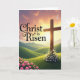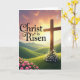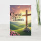 At the center of the card is a tall, dark wooden cross rising from a gently rolling green hill, set against the first light of morning. A warm sun glows near the horizon, washing the sky in amber, peach, and soft lavender, like a quiet sunrise shared side by side. On the left, a flowing cursive-style message about rising again is placed high against the bright sky, printed in a dark tone for contrast. On the right, a ring of small white blossoms gathers at the base of the cross, arranged like a tender offering that feels like a caring gesture between close friends. In the foreground, clusters of pink flowers spread across the grass, adding spring color alongside a small 🌷. Farther back, layered green hills fade into a light haze, keeping the scene gentle and calm. Soft clouds stretch across the upper sky, and a tiny 🐇 sits low near the flowers as the light brushes the hilltop.