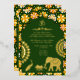 This customizable luxurious emerald hindu wedding invitation features a lush green backdrop adorned with vibrant marigold florals, a traditional moghul arch, and gold foil accents of script, peacock, lotus, om, mandala and elephant motifs. The rich, ornamental details create an elegant and festive atmosphere perfect for a traditional hindu wedding celebration.