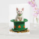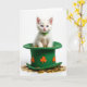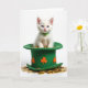 This card features a fluffy white kitten nestled inside the brim of an emerald-green leprechaun hat, giving the scene a sweet, cozy St. Patrick’s Day feel 💚. The kitten’s wide sapphire-blue eyes meet yours with a gentle, trusting look, like it’s sharing a quiet moment with a close friend. A lime-green collar circles its neck, finished with a tiny golden bell that catches the light as if it just jingled. The hat is decorated with small orange shamrocks that stand out against the deep green fabric, adding a cheerful pop of color ☘️. Along the bottom, gold coins spill and scatter around the base, their metallic shine contrasting with the soft white background. The greeting text sits above the kitten in green lettering, while a smaller line of text is placed near the coins in warm gold. The background stays mostly white and airy, with the kitten’s fur, the hat’s stitching, and the coin highlights clearly visible in the foreground.