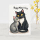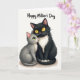 This card shows two close feline companions posed against a plain white background, creating a quiet scene of closeness ❤️. A larger black cat sits at the center with bright yellow almond-shaped eyes and a soft white ruff flowing down its chest. Tucked snugly against its side is a smaller grey kitten with green eyes, tilting its face upward with a tender, trusting look as its pink nose rests near the larger cat’s shoulder. Their bodies curve toward each other, and their tails meet near the base like a gentle link that hints at affection and care. Fine whiskers and softly shaded fur textures add a cozy, touchable feel without any extra scenery. Near the top, the words “Happy Mother’s Day” appear in a dark, flowing letter style, spaced above the cats so the message reads clearly 🌼. The black coat contrasts strongly with the white chest fur, while the kitten’s smoky grey tones sit softly beside it.