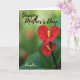 This design shows two deep red blossoms shaped like soft hearts, placed slightly to the right against a smooth, emerald-green background that fades gently out of focus. The larger flower sits above with crisp edges, while the smaller one below leans in close, suggesting a tender, caring bond ❤️. Each bloom has a long, sunny yellow center that draws the eye and adds a warm contrast to the rich red petals. The lighting is soft and natural, giving the scene a calm, intimate feel without harsh shadows. A dark line of text sits near the top of the card, centered and easy to spot against the green. Near the bottom, a lighter line of text appears as a small sign-off, spaced neatly so it doesn’t crowd the flowers 🌼. A clear droplet clings to the lower tip of the top bloom, catching a tiny highlight.