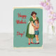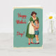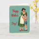 This greeting card shows a cozy, retro-style scene of a woman and a young boy sharing a close hug, set against a calm teal background that feels gently nostalgic ❤️. The woman stands on the right with dark, neatly styled hair, a bright smile, and an emerald-green dress pulled in at the waist by a white apron with soft ruffled edges. She looks down at the boy with a tender expression, and he beams back as he wraps his arms around her waist, giving the moment a sweet, affectionate closeness. He wears a red-and-white striped top, blue shorts, and burgundy shoes with white socks, adding a friendly pop of color alongside her red pointed heels. On the left side, the message “Happy Mother’s Day!” appears in flowing red lettering, large and easy to spot, balancing the figures on the opposite side 🌼. The lighting is bright and even, making the colors stand out while keeping the scene soft and welcoming. A subtle aged border frames the teal background, and the red text sits prominently on the left while the embracing pair fills the right.