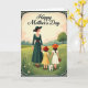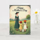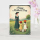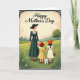 Designed with a gentle outdoor scene, this card shows a woman in a deep emerald dress with white lace trim and a wide-brimmed hat walking through a meadow with two children. She holds hands with a girl in a sunny yellow gingham dress and red hat, and the girl links hands with a smaller child in a cream dress and orange hat, creating a sweet, close-knit chain that feels affectionate ❤️. A small white dog trots beside them on a leash, adding a cozy, companionable touch to the stroll. The grassy landscape rolls in soft greens, sprinkled with tiny white wildflowers and tall blades that sway around their feet. In the distance, muted hills and a single sturdy tree sit beneath a pale, calm sky that gives everything a nostalgic glow. A decorative border frames the illustration, and “Happy Mother’s Day” appears centered at the top in a dark contrasting color. One child carries a small basket, and the hats, lace details, and scattered meadow blooms 🌼 are drawn with delicate, storybook-style lines.