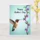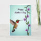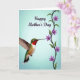 Designed with a tender nature scene, the card features a tiny winged bird hovering in midair near the lower left, angled toward the right as if drawn closer by affection ❤️. Its feathers shimmer in emerald green with a ruby-red throat, a crisp white band at the neck, and a long beak pointing toward the flowers. Along the right side, a dark vine climbs upward with several soft purple blossoms, each showing reddish stamens and fresh green leaves that feel like a gentle offering. The background fades from pale aqua into muted teal, giving the whole setting a calm, airy glow. Near the top, the words “Happy Mother’s Day” appear in dark lettering, centered above the illustration for easy reading 🌼. The bird’s forward-leaning pose and the blossoms’ upward reach create a quiet, romantic sense of connection, like a shared moment between two close companions. The purple flowers cluster along the right edge while the bird remains low on the left against the smooth aqua-to-teal backdrop.
