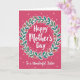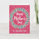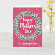 The front design shows a rich fuchsia background with a soft gradient that lightens toward the center, drawing your eye inward. In the middle sits a circular wreath made of alternating emerald and teal leaves, dotted with small coral flowers with darker centers, and each leaf and petal is edged with a thin white outline. Inside the ring, the main message “Happy Mother’s Day” appears in bright white lettering, centered and slightly glowing against the rosy backdrop ❤️. Tiny white dots and small star-like shapes are sprinkled around like gentle confetti, adding a light celebratory touch without feeling busy. Beneath the wreath, the line “To a Wonderful Sister” is placed neatly in white, aligned under the circle to keep the layout balanced. The cool greens and warm corals lean toward a friendly, affectionate mood, like a close hug shared between family members 🌼. Around the wreath, scattered white specks and petite star shapes float across the pink background.