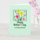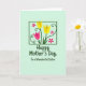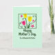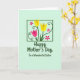 This card features a pale aquamarine background that feels soft and airy, setting a gentle, affectionate tone ❤️. Centered on the front is a dark emerald green rectangular frame holding a close-knit bouquet of stylized plants that lean toward one another like friends sharing a quiet moment. Inside the frame, three tall flowers rise on slim green stems with curling tendrils, with two blooms in sunny yellow and one bloom in rich fuchsia. Small fuchsia star-like accents are sprinkled around the flowers, adding a light, celebratory sparkle 🌼. Below the framed bouquet, a large line of deep forest green text sits centered and reads “Happy Mother’s Day” in a flowing, handwritten look. Directly underneath, a smaller centered line in the same forest green reads “Love You Mom,” placed with extra spacing so it feels tender and close. The green border is thick and even, and the fuchsia stars sit near the upper flowers inside the rectangle.