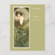 A postcard featuring the art illustration by Alphonse Mucha (1860-1939) titled Emerald from the Precious Stones Series (1900). A portrait a fashionable woman in a green gown, with green foliage in the foreground. The chair has animal heads which was inspired by a chair Mucha owned.