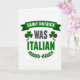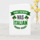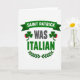 Designed with a bright white background, this St. Patrick’s Day card centers a cheeky statement that reads “SAINT PATRICK WAS ITALIAN” in stacked lines. “SAINT PATRICK” sits across the middle on a deep emerald ribbon banner, and the letters are white so they stand out clearly. Just below, “WAS” appears in charcoal gray, quietly bridging the top line to the last word like a pause before the punchline. Two small shamrocks sit to either side of “WAS,” colored rich green with a tiny red crescent accent that nods to Italy and adds a wink of inside-joke charm 💚. “ITALIAN” anchors the lower section in a brighter green, giving the bottom line extra weight and making the twist feel confident. A dark green laurel wreath curves around the lower text, adding a classical touch that can feel like a clever toast shared between close friends ☘️. The layout is symmetrical and tidy, with flat shapes, sharp edges, and the laurel leaves forming an oval frame around the lower half of the wording.