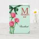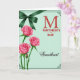 This card features three soft pink roses along the left side, their layered petals brushed with pale highlights that make them glow, and a small rosebud near the top that suggests growing affection ❤️. The flowers rise on thin green stems against a mint-green background with a lightly woven texture that adds depth. In the top-left corner, an emerald-green ribbon is tied into a neat bow, like a small gift tucked into the scene. On the right side, large red text announces the occasion, starting with an oversized, ornate first letter that stands out immediately. Beneath it, a smaller flowing line of red text sits lower on the right, shaped like a gentle note between close hearts 🌼. A slim dark border runs around the edges, with curled decorative flourishes set into each corner. The mint-green backdrop shows a subtle fabric-like pattern behind the roses and the red lettering.
