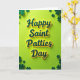 On the front of the card the vertically stacked words “Happy Saint Patties Day” sit center stage in deep, glossy emerald letters edged with a glowing yellow outline, giving the text a raised, three-dimensional look. The lettering feels like it’s leaning in close, as if the message is being offered with a friendly, almost romantic warmth 💚. Behind it, a smooth lime-green background keeps the scene bright and festive without competing with the main phrase. Around the edges, stylized shamrocks in slightly darker greens drift like little companions, framing the message the way friends gather around a toast ☘️. Each clover has gentle shading and a soft shadow that adds depth, making the layout feel layered and touchable. The yellow outline around the letters adds a sunny halo effect that draws your eye from top to bottom as you read. Share St. Patrick’s Day sentiments with someone special. The shamrocks vary in size and spacing along the border, with subtle shadows that lift them off the green backdrop.