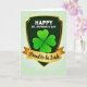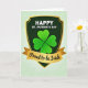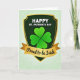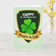 This card features a deep emerald green, shield-shaped emblem edged with a shining gold outline, giving it a classic St. Patrick’s Day look ☘️. Inside the shield sits a four-leaf clover with a gentle green gradient, its rounded leaves arranged neatly at center like a small token meant to be shared between close friends 💚. Across the top of the shield, the phrase “HAPPY ST. PATRICK’S DAY” appears in white, set in strong, easy-to-read lettering. Beneath the clover, a gold ribbon banner unfurls, carrying the words “Proud to be Irish” in black, flowing lettering that feels like a warm note tucked into the design. The layout keeps the text stacked and balanced, so your eyes move from the greeting down to the banner in one smooth line. Behind everything, the background shifts to a lighter green, letting the darker shield stand forward with a cozy, welcoming contrast. Thin, wavy white lines crisscross the backdrop in a soft pattern, like a light woven texture under the central emblem.