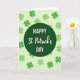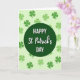 Designed with a festive St. Patrick’s Day look, the card centers on a deep emerald green circle that anchors the whole scene. Inside that circle, the message “HAPPY St Patrick’s DAY” sits in crisp white, with “HAPPY” and “DAY” in a straightforward sans‑serif style and “St Patrick’s” in a flowing calligraphic style. The contrast feels a bit like two friends leaning in for a toast—steady and clear around a softer, more affectionate middle. Behind the circle, a pale mint-green background sets a light, cheerful stage, dotted with shamrocks in several greens for extra texture. Some clovers look airy and translucent while others are richer and darker, like layers of lucky leaves scattered across a field ☘️. The text stays neatly centered within the circle, while the shamrocks spread outward across the background to frame it without crowding. Share a little St. Patrick’s Day cheer with someone you care about 💚, with scattered three-leaf clovers in lime and emerald floating across the mint backdrop.