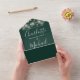 All in one wedding invitation with pretty string lights, signature style names and chic typography on an emerald green background. The invitation includes a perforated RSVP card featuring a QR code. Designed by Thisisnotme©