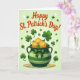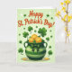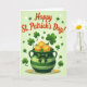 This card shows a large pot with emerald-green stripes, shaded to look rounded, spilling a pile of gold coins stamped with tiny three-leaf shamrocks ☘️. A dotted-and-striped bow wraps the pot, and the neat patterns give it a dressed-up, friendly look, like it’s ready for a shared celebration 💚. Big green shamrocks rise from the pot and float around it, their curving stems leaning toward one another the way close friends might. The background is a soft, pale green gradient that keeps the scene light and airy while letting the greens and gold stand out. Across the top, the text “Happy St. Patrick’s Day!” sits centered in warm red lettering, with small white sparkles sprinkled nearby. Two extra coins rest at the bottom edge, as if they’ve rolled out to be noticed. Large shamrocks and scattered coins frame the pot against the gentle green backdrop, with the bow’s polka dots and stripes clearly visible.