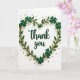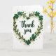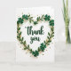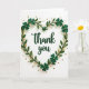 This greeting card centers on the words “thank you” in dark emerald lettering, set neatly inside a heart-shaped wreath that feels like a gentle embrace. The wreath is built from layered paper leaves and small shamrocks in deep green, with tiny gold studs at their centers that catch the light like shared glances between close friends. Soft shadows under the raised pieces add depth, making the heart look almost touchable against the bright white background. Around the wreath, scattered gold dots sit like confetti, adding a light sparkle without crowding the main design. The green-and-gold palette brings a cozy St. Patrick’s Day feel 💚☘️, while the heart shape keeps the mood tender and affectionate. The text is placed in the middle of the heart, balanced and easy to read, with the dark emerald color standing out clearly from the white space. The gold speckles are irregular in size and spacing, drifting across the background like tiny flecks of foil.