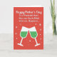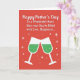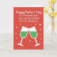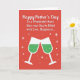 This greeting card features a rich crimson background that sets a cozy, celebratory mood right away. Across the upper two-thirds, a Mother’s Day message sits centered in bright white lettering, with a flowing main line and a simpler supporting line beneath it for easy reading. The strong white-on-red contrast makes the words stand out clearly, like a note meant to be read aloud with a soft smile ❤️. In the lower section, two stylized stemmed glasses tilt toward each other, capturing a friendly, affectionate toast. Each glass is white with an emerald green drink inside, dotted with tiny white bubbles that suggest a light, fizzy sparkle. Small white starbursts and scattered dots float around the glasses, adding a gentle touch of celebration 🌼. The two glasses meet near the bottom center, with the starbursts clustered closely around the point where their rims touch.