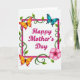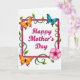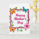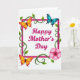Designed with a bright digital illustration style, this card centers on the words “Happy Mother’s Day” in deep magenta lettering on a white background. The message sits inside a thin fuchsia rectangle, with curling green vines wrapping around it like a gentle hug ❤️. Fresh leaves sprout along the vines, suggesting a garden moment shared with someone you care about, the way close friends or family lean in toward each other. Three butterflies bring movement: one turquoise butterfly with tiny white markings floats near the upper right, while two orange butterflies with red-tipped wings rest along the left side. A soft pink, many-petaled flower with a darker crimson center anchors the lower right, adding a tender, romantic touch 🌼. Subtle shading and smooth gradients give the leaves and wings a light, airy depth. The turquoise butterfly appears near the top right corner, opposite the pink flower at the lower right, with the orange butterflies clustered to the left of the magenta text.