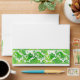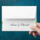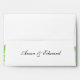 The combination of minimalist textured background with an intricate, shimmering, bright emerald green damask border, like bright spring greenery dappled by the sun, and inside lining sets this envelope apart. The striking floral damask sweeps and curls lavishly up to a diamond-studded edge. On the back of the envelopes are the couple's names in script font - this is optional, and completely customizable by you.