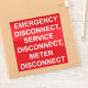 An EMERGENCY DISCONNECT, SERVICE DISCONNECT, METER DISCONNECT sticker label to help electricians satisfy the requirements of Article 230.85(E)(1) and (2) in the 2023 National Electrical Code.