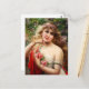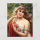 Emile Vernon Spring postcard. Oil painting on canvas from 1913. French painter Emile Vernon devoted much of his career to painting beautiful young women. Spring or Le Printemps features a pretty young lady with light brown hair in a garden. She wears a red sash, gold bracelet, white dress and pearl necklace. She also holds two dark pink roses in her left hand and smiles on prettily. A beautiful gift for fans of Emile Vernon, art nouveau, and French art.