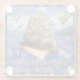 This original fantasy scene glass drink coaster is based around the Emily Dickinson poem that begins, "There is no Frigate like a Book To take us Lands away." The quote appears at the bottom, below a masted sailing ship made of an antique book. The words are also scrawled throughout: on the torn-looking sails, wrapped around the balloon in the distance, decorating the wings of a dragonfly that has a pencil body. They even faintly appear on the faded rainbow.