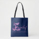 Pretty E monogram art name bag in shades of pink and purple. Personalize with your own name beginning with E, and name meaning for a truly personalized bag, this example is for the name E Emily Industrious, vibrant, forever striving perfection. © Unique E monogram hearts and flowers drawing description and graphic art design by Sarah Trett. www.sarahtrett.com for www.mylittleeden.com