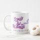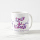 Hand drawn letter E name and meaning mug. Pretty heart and flower capital E doodled typographic design featuring hearts and flowers and the words Emily Industrious, vibrant, forever striving perfection in pink and purple. © Unique art and design by Sarah Trett. www.sarahtrett.com for www.mylittleeden.com on zazzle