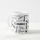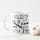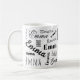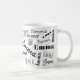 Introducing a unique typography custom name mug that highlights "Emma", this coffee cup stands out. It’s unmistakably Emma's, thanks to the personalized name emblazoned on it.. The initial "E" script is prominently displayed in the background, adding depth to the design