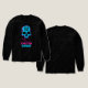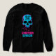 This design is a masterclass in modern digital aesthetic, featuring a skull marked with a unique QR code graphic, blending retro-futurism with a modern "glitch" vibe. The striking cyan and hot pink palette stands out sharply against the black fabric, creating a look that is part vaporwave, part cyberpunk.