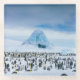 This photo features an emperor penguin colony with frozen icebergs as a backdrop.