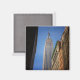 A gorgeous view of the Empire State Building and a variety of other New York City buildings looking down a street in midtown. The sun illuminates the Empire State Building and a beautiful blue sky acts as the perfect backdrop.