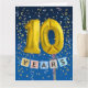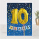 This is a fun employee 10th anniversary card design featuring the number 10 shown in gold colored balloons. Each balloon has a flowing curly ribbon attached. The balloons are set against a blue background sprinkled with falling confetti. There are also some confetti letters, with gold foil effect overlay, where the letters are those of the word CONGRATULATIONS. Underneath the balloon is bunting with the letters Y E A R S.