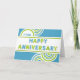 This is a bright, eye catching, employee 1st anniversary card in blue, green and white. The design features the centrally placed text 'HAPPY ANNIVERSARY' in a layered effect font. Above and below this text are circular, decorative elements in matching colors to the text. The number of years is written within the lower of the two circular shapes above the central text.