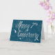 This is a fun seven year Employee Anniversary Card featuring the text 'Happy 7th Anniversary', written in a swirly font with a digitally added silver foil effect overlay. The text is set against a blue background with a feint swirly pattern. In addition, there are three star bursts each of which has a digitally added silver sparkle effect. All in all a fun, bold and celebratory design