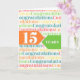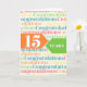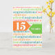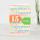 This is a colorful Employee Anniversary 15 Years Congratulations card. The background congratulations pattern features the repeated word 'Congratulations' written in red, orange, yellow, green and jade against a white background. The text '15 YEARS' is written on two centrally placed point tipped labels, one in orange and one in green, with a drop shadow to give the illusion of the labels standing out from the background.