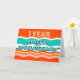 This is a brightly colored Employee 1st Anniversary card in red, orange and jade featuring waves of color and the text, HAPPY ANNIVERSARY in a fun stripy, flowing font. At the top is the text 1 YEAR, in a contrasting, plain, bold font with orange and white patterned detail.