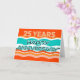 This is a brightly colored Employee 25th Anniversary card in red, orange and jade featuring waves of color and the text, HAPPY ANNIVERSARY in a fun stripy, flowing font. At the top is the text 25 YEARS, in a contrasting, plain, bold font with orange and white patterned detail.