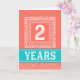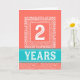 This is a distinctive and attractive design in coral, white and turquoise. The number 2, in white, is set within a square surround which is decoratively bordered. Part of the bordering consists of a swirly waves pattern and it is completed with an outline consisting of the word CONGRATULATIONS which is written four times around the square.