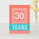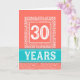 This is a distinctive and attractive design in coral, white and turquoise. The number 30, in white, is set within a square surround which is decoratively bordered. Part of the bordering consists of a swirly waves pattern and it is completed with an outline consisting of the word CONGRATULATIONS which is written four times around the square.
