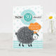 This is a fun employee 30 years anniversary card featuring a wonderfully quirky sheep illustration, where the sheep is wearing an orange bobble hat, green round rimmed spectacles and super trendy wellies. The text at the top reads 'WOW, 30 YEARS, already!', where the '30 YEARS' is in a digitally created badge effect. Beneath that is the sheep illustration, above which is an orange speech bubble and the text 'baaaaarely believable', where the a's in the word baaaaarely are out of alignment, to simulate the wobbly 'baaaaa' sound that sheep make.
