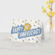This is a fun employee 35th anniversary card in mainly blue and white. The words 'HAPPY' and 'ANNIVERSARY' are written in white on two separate, blue text boxes which are placed on the slant, horizontally across the card. The '35th' is written in white on a tan colored, eight point, star and placed to the right of the word 'HAPPY' and above the word 'ANNIVERSARY'. There is also a narrow gold sparkle effect border towards the edge of the star. The text boxes and star have a minimal drop shadow which gives the effect of being slightly raised from the background. The background pattern is mainly blue and white but there is also some creatively contrasting yellow and tan in the mix too.