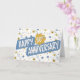 This is a fun employee 50th anniversary card in mainly blue and white. The words 'HAPPY' and 'ANNIVERSARY' are written in white on two separate, blue text boxes which are placed on the slant, horizontally across the card. The '50th' is written in white on a tan colored, eight point, star and placed to the right of the word 'HAPPY' and above the word 'ANNIVERSARY'. There is also a narrow gold sparkle effect border towards the edge of the star. The text boxes and star have a minimal drop shadow which gives the effect of being slightly raised from the background. The background pattern is mainly blue and white but there is also some creatively contrasting yellow and tan in the mix too.