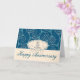 In the lower section of the design is a cream colored text box on which is written: 'Happy Anniversary' in a beautifully flowing script font and in a matching blue and sparkle effect to the swirly pattern.