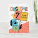 This is a fun and colorful employee 7 year anniversary card featuring a comical dog illustration. The dog is wearing huge glasses and has a sign with him on which is written: '7 YEARS ALREADY!', above which is the text: DOGGONE which is written in an illustrated, colorful font.