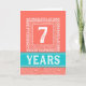 This is a distinctive and attractive design in coral, white and turquoise. The number 7, in white, is set within a square surround which is decoratively bordered. Part of the bordering consists of a swirly waves pattern and it is completed with an outline consisting of the word CONGRATULATIONS which is written four times around the square.
