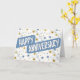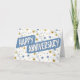 This is a fun employee anniversary card in mainly blue and white. The text: HAPPY ANNIVERSARY is written in white on two blue text boxes which are placed on the slant, horizontally across the card. The text boxes have a minimal drop shadow which gives the effect of being slightly raised from the background. The background which has a lively feel to it, is mainly blue and white but there is also some creatively contrasting yellow and tan in the mix too.
