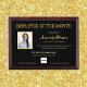 Employee Of The Month Photo Logo Gold Lettering on black fond design. This is a totally personalizable template really easy to use. Reward and give thanks to your company employees for their dedication with this elegant award perfect for ceremonies and company events. You can customize the text, the photo, and the logo. Click on personalize to start customizing your employee awards!